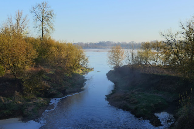 Wschód nie jest spektakularny. Słońce zasłania wstęga nieruchomych chmur. Zamiast tarczy widzę wielką plamę światła za konarami i gałęziami drzew drugiego brzegu. Nurt rozjaśniony szerokim warkoczem. Poluję na sylwetki ptaków przecinających świetlne smugi...
